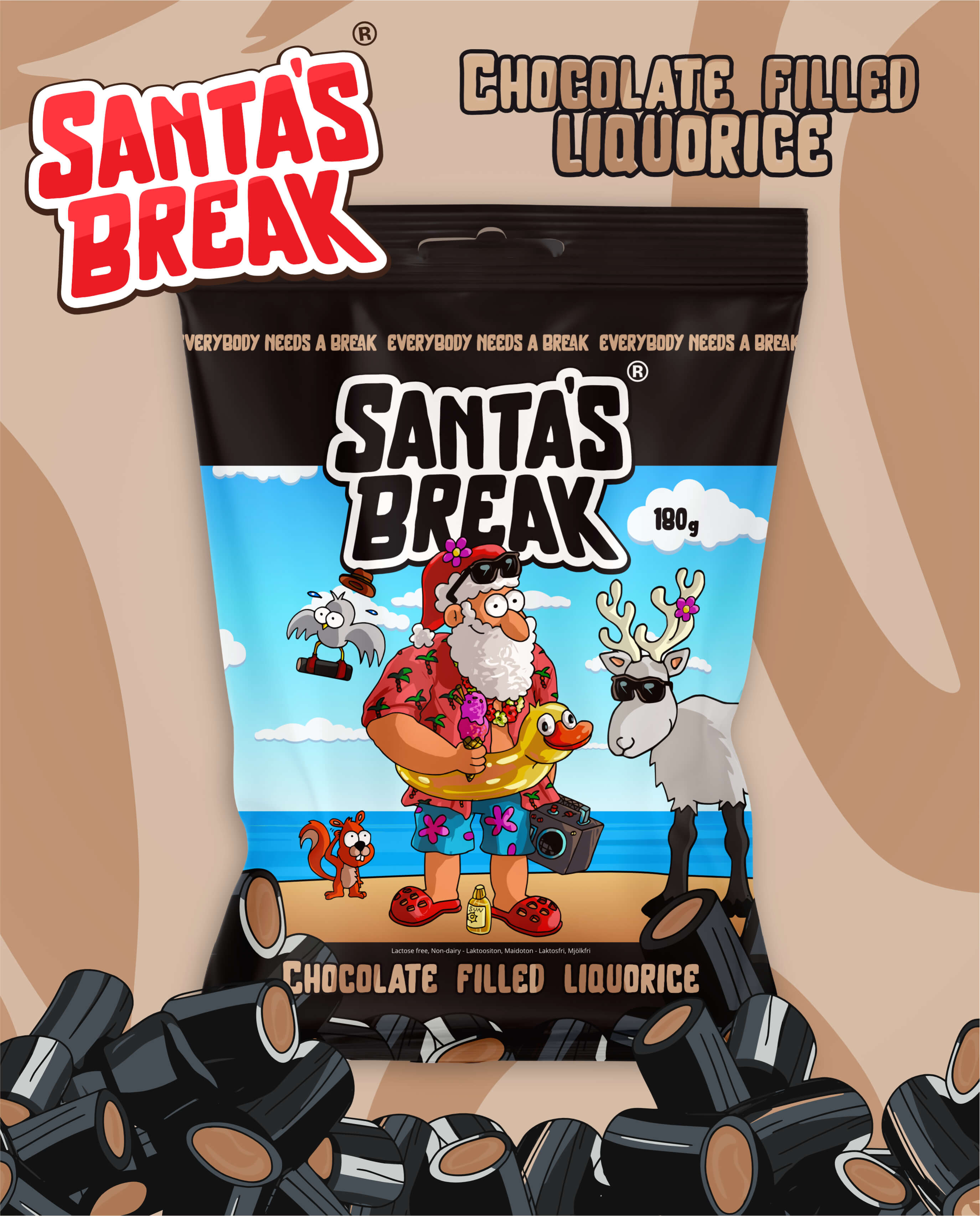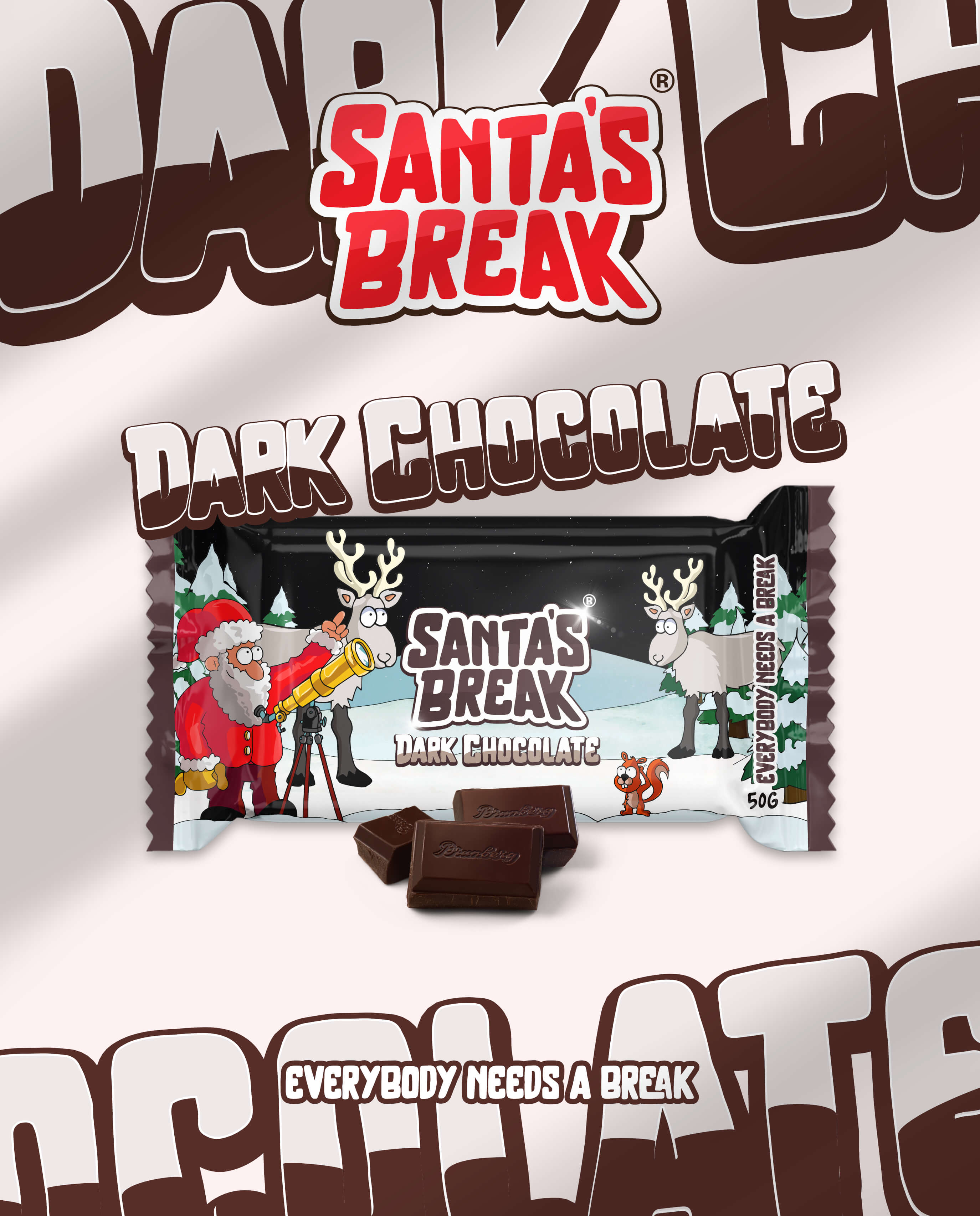 Brändimme ydinajatus kiteytyy sloganiin: “Everybody needs a break” – jokainen tarvitsee hetken hengähdystauon. Jokainen suupala, jokainen kulaus Santa’s Breakin tuotteita tempaa mukaansa tähän lumoavaan ilmapiiriin. Haluamme viettää joulua vuoden jokaisena päivänä.
