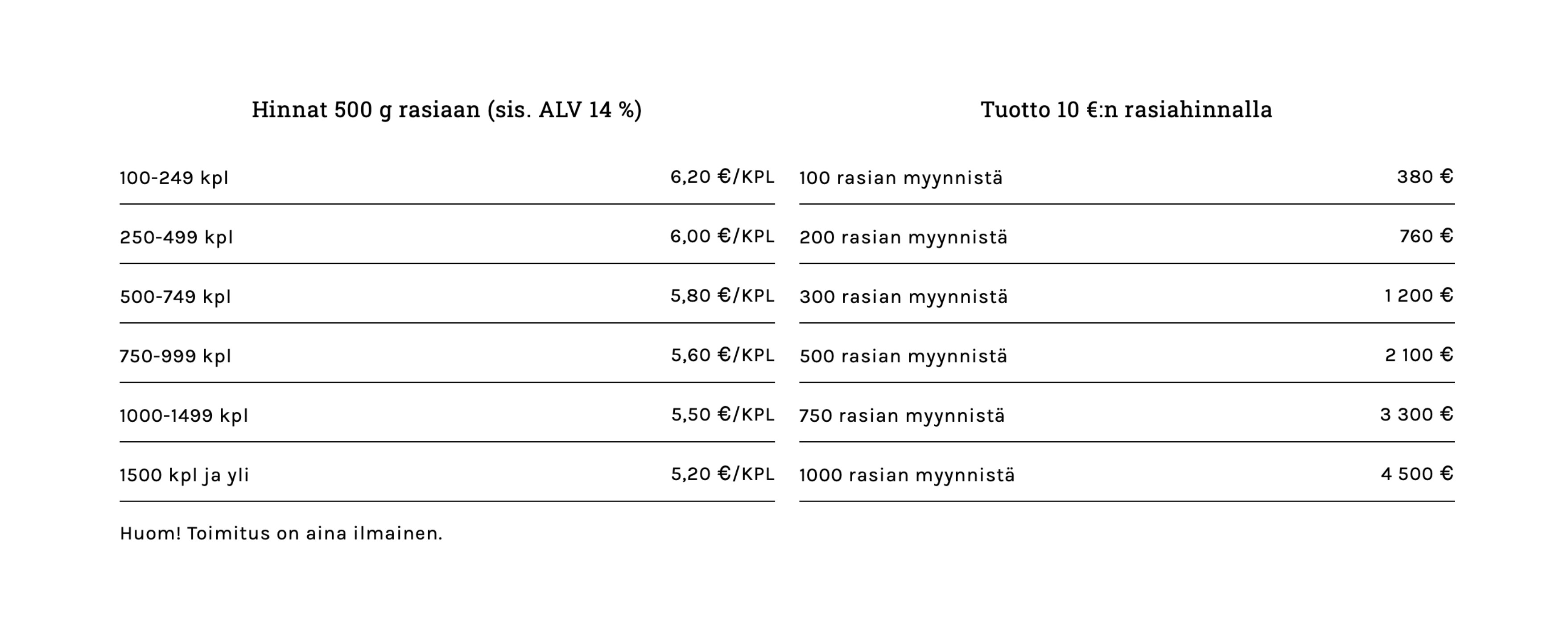Lähettämällä lomakkeen hyväksyt toimitusehdot ja sitoudut tilaamaan ilmoitetun määrän.
